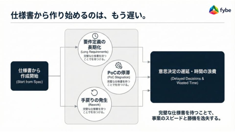 新しいサービスや業務改善のアイデアがあっても、「まずは仕様書を固めよう」と考えた瞬間に、動きが止まってしまう。そんな経験をした人は少なくないのではないでしょうか。時間をかけて整理したはずなのに、気づけば現場の熱量が下がり、結局は試作の段階で終わってしまう。今のビジネス現場では、こうした“止まり方”が珍しくなくなっています。