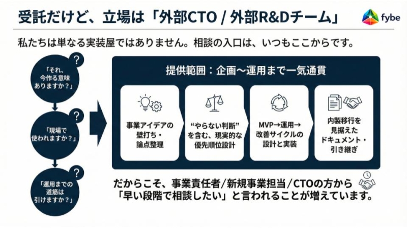 一方で、最近はその関係性自体を見直す動きも出てきています。完成形を前提に話を進めるのではなく、アイデアが固まりきっていない段階から関わり、考える部分も一緒に整理していく。開発というより、事業や業務の相談相手に近い立ち位置です。
