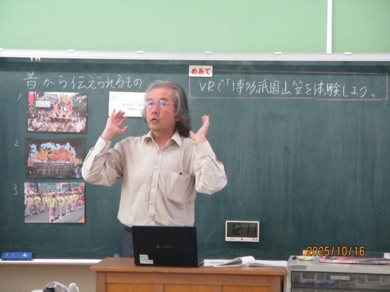 授業は、冒頭に「これから山笠に行きます」という呼びかけからスタート。児童たちはVRゴーグルを装着し、祭りの動き・音・水しぶきといった360度映像に包まれて、教室という場を超えた体験をしました。映像の最中、児童からは「えっ!スゴい!」「目の前で走っとる!」「水かけられた!」といった声があがりました。